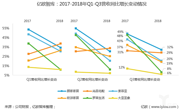 其次,2018年家居行業(yè)業(yè)績增速整體出現(xiàn)下滑。億歐智庫整理了頭部幾家企業(yè)的財務數(shù)據(jù),通過2017-2018年Q1-Q3三個季度營業(yè)收入增速對比,除了尚品宅配前兩個季度,以及歐派Q1季度保持正向增長外,其他幾家企業(yè)增速都在下降。